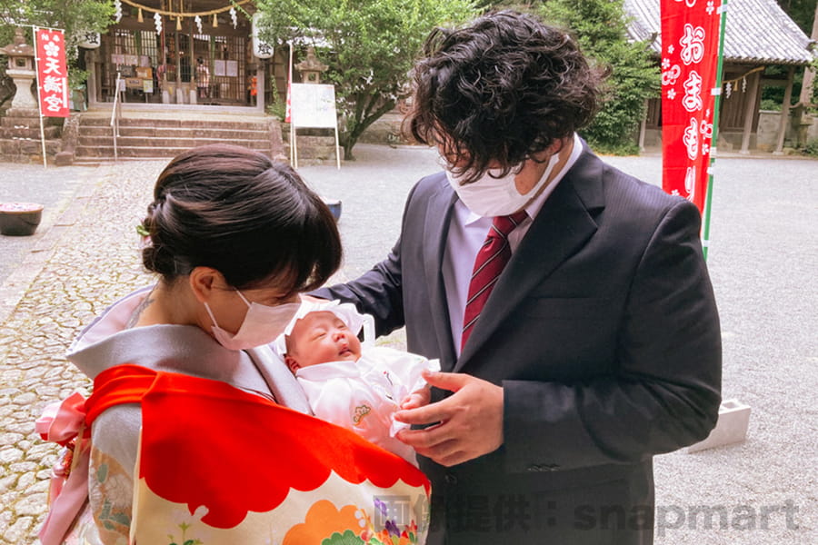 ※神社・お寺でのお宮参りの赤ちゃんとご夫婦のイメージ|写真提供:snapmart