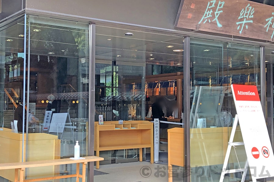※明治神宮 お宮参り御祈祷の申し込みを行う神楽殿と中の御祈祷受付の様子|画像提供:お宮参りドットコム