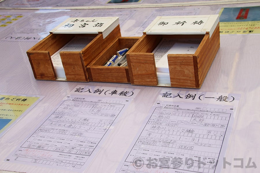 ※鶴岡八幡宮 御祈祷受付所に設置された御祈祷申込用紙(初宮詣=お宮参りのものもあり)と記入台の記入例の様子|画像提供:お宮参りドットコム