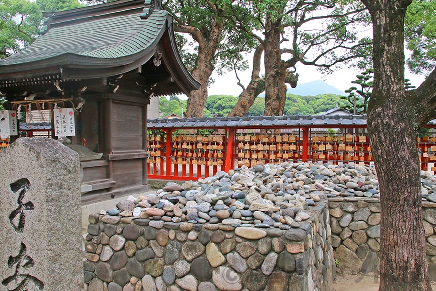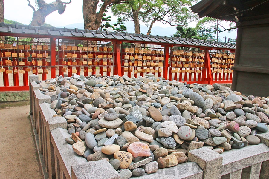 こちらは安産祈願を終えた妊婦の方が、「お産の鎮め」として石を持ち帰り、出産の暁に別の新しい石にお子様の名前などを書くことで健やかな成長を願い、安産のお礼としての初宮詣(お宮参り)の際、祈願後持ち帰った石とともに、一緒にここに納める、という慣わしとなっているとのこと。