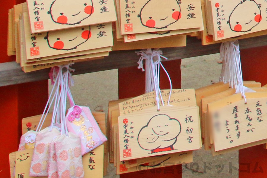 初宮(お宮参り)の絵馬も多く見られ、またお宮参りの際、感謝を込めて安産の御守をここに納めて(掛けて)いる様子も多く見られます。