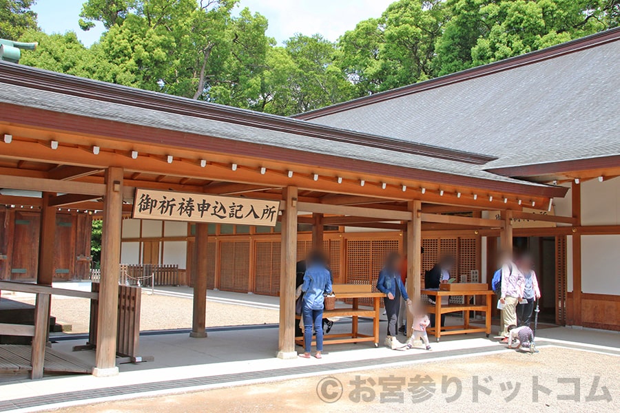 写真のように御祈祷受付所窓口の手前に御祈祷の申込用紙が置かれた記入所があるので、そこで申込用紙に記入をして窓口にて申し込みを行います。