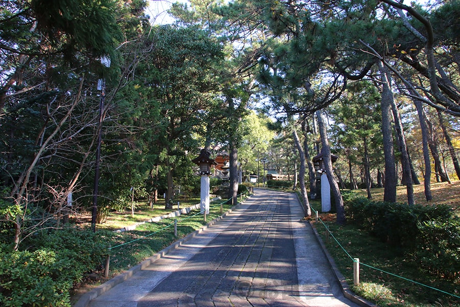 こちらは国道14号線沿いの入口から本殿へ向かう境内参道の様子です。境内全体は多くの緑に囲まれており、また境内全体が小高い丘になっているので、本殿に向かって上っていく形になります。