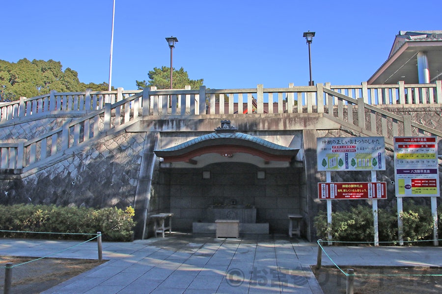 先述のように、こちらの入口のスロープは「自動車のお祓い(交通安全祈願)」用の車の入口になり、参拝者用の駐車場は別のところにあります。