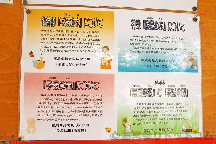先述の子安の木や子安の石など、宇美八幡宮をお宮参りで訪れた方向けの作法ややり方を記した案内が境内の多くのところにあります。