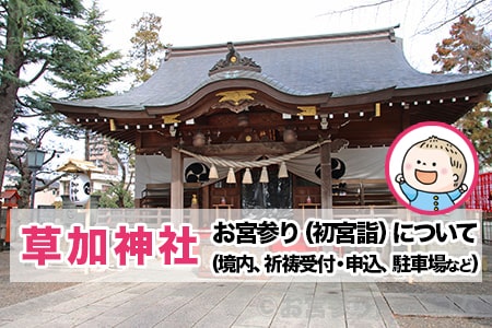 草加神社のお宮参り詳細についてお伝えします。祈祷の受付場所から申込方法や祈祷の場所、待ち合いスペースや駐車場についてなど、草加神社でのお宮参り当日におさえておきたいことなどお伝えします。